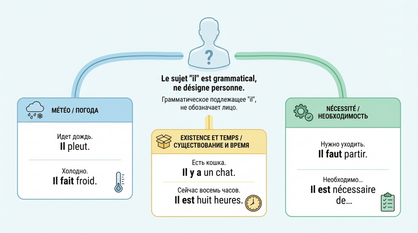 - Метеорологические выражения: il pleut (идёт дождь), il fait froid (холодно)