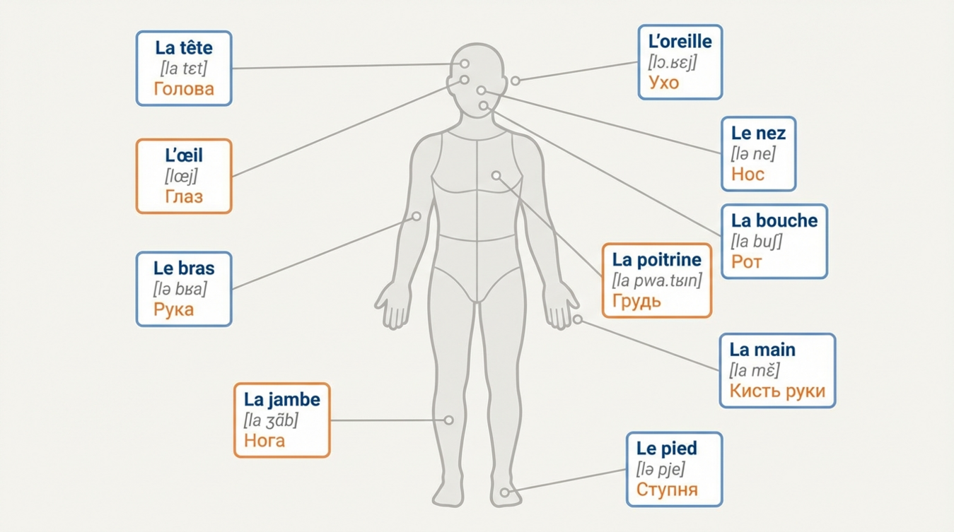 Le corps [лё кор] — тело. Это слово мужского рода, и от него образуются многие производные термины. Запомните: во французском языке род существительного влияет на форму прилагательных и артиклей, поэтому знание рода анатомических терминов — не прихоть, а необходимость.