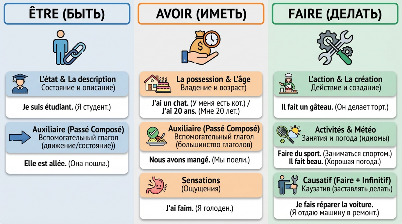 Глаголы faire (делать), avoir (иметь) и être (быть) выполняют во французском языке три критические функции: служебную, семантическую и идиоматическую. В служебной роли они образуют сложные времена — passé composé, plus-que-parfait и другие. Здесь avoir и être выступают как вспомогательные глаголы. В семантической функции они передают основное действие или состояние. Но именно идиоматическая роль делает эти глаголы незаменимыми для свободного владения языком.