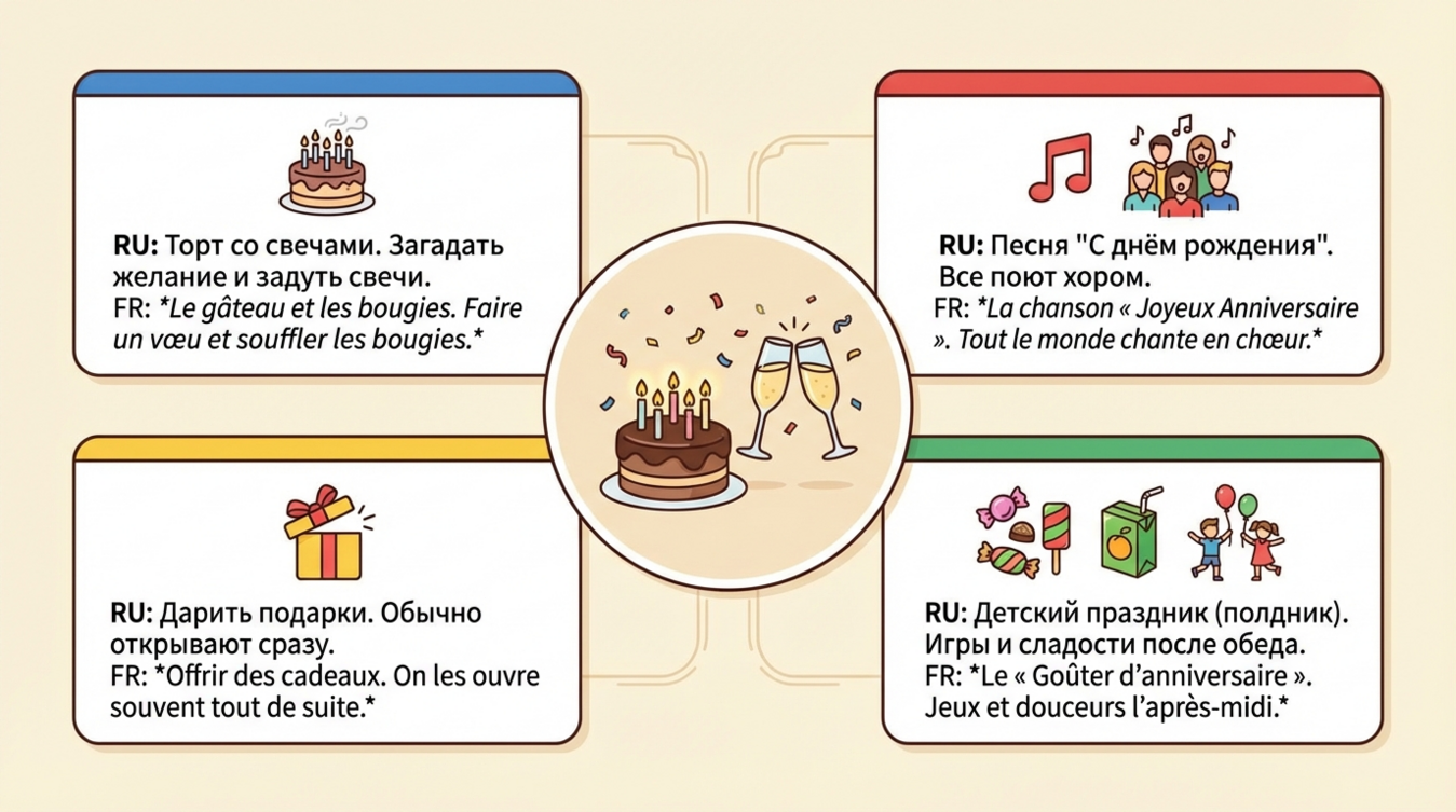 🎂 Момент задувания свечей на торте (souffler les bougies) — кульминация вечера. Именинник загадывает желание и должен задуть все свечи с одного раза, чтобы оно сбылось. При этом гости поют традиционную песню "Joyeux anniversaire" — французскую версию "Happy Birthday". После этого следует аплодисменты и возгласы "Hip hip hip, hourra!"