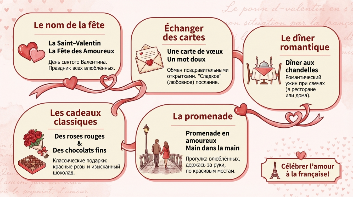 Начнём с главного: во Франции День Святого Валентина называют la Saint-Valentin или la Fête des Amoureux (праздник влюблённых). Этот день здесь — не повод для массовых гуляний, а интимное событие для двоих. Французы избегают показной романтики и предпочитают тонкие, изысканные проявления чувств.