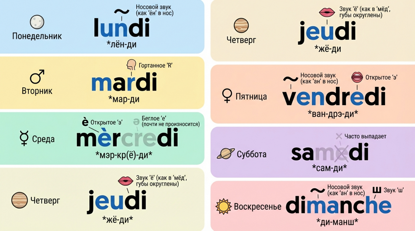 Главная фонетическая ловушка — носовые гласные в словах lundi, mardi, mercredi, jeudi, vendredi. Русскоговорящие студенты часто произносят их как обычные [н] или [м], что грубейшая ошибка. Носовой звук образуется, когда воздух проходит одновременно через рот и нос — буквосочетания -di в конце создают специфический французский оттенок.