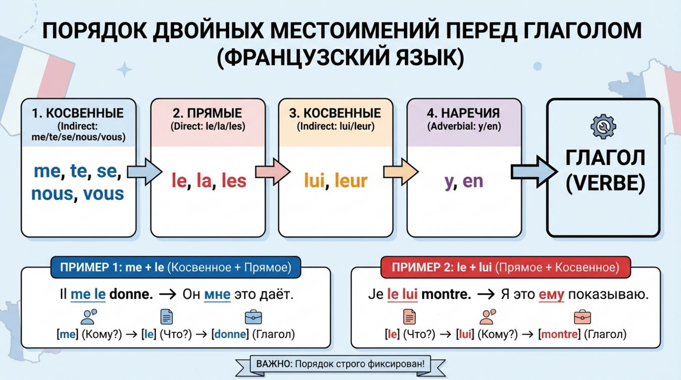 Ключевая сложность: некоторые местоимения (me, te, nous, vous) многофункциональны и могут быть как прямыми, так и косвенными. Их позиция определяется не типом, а порядком в цепочке, о которой речь пойдёт дальше 📊