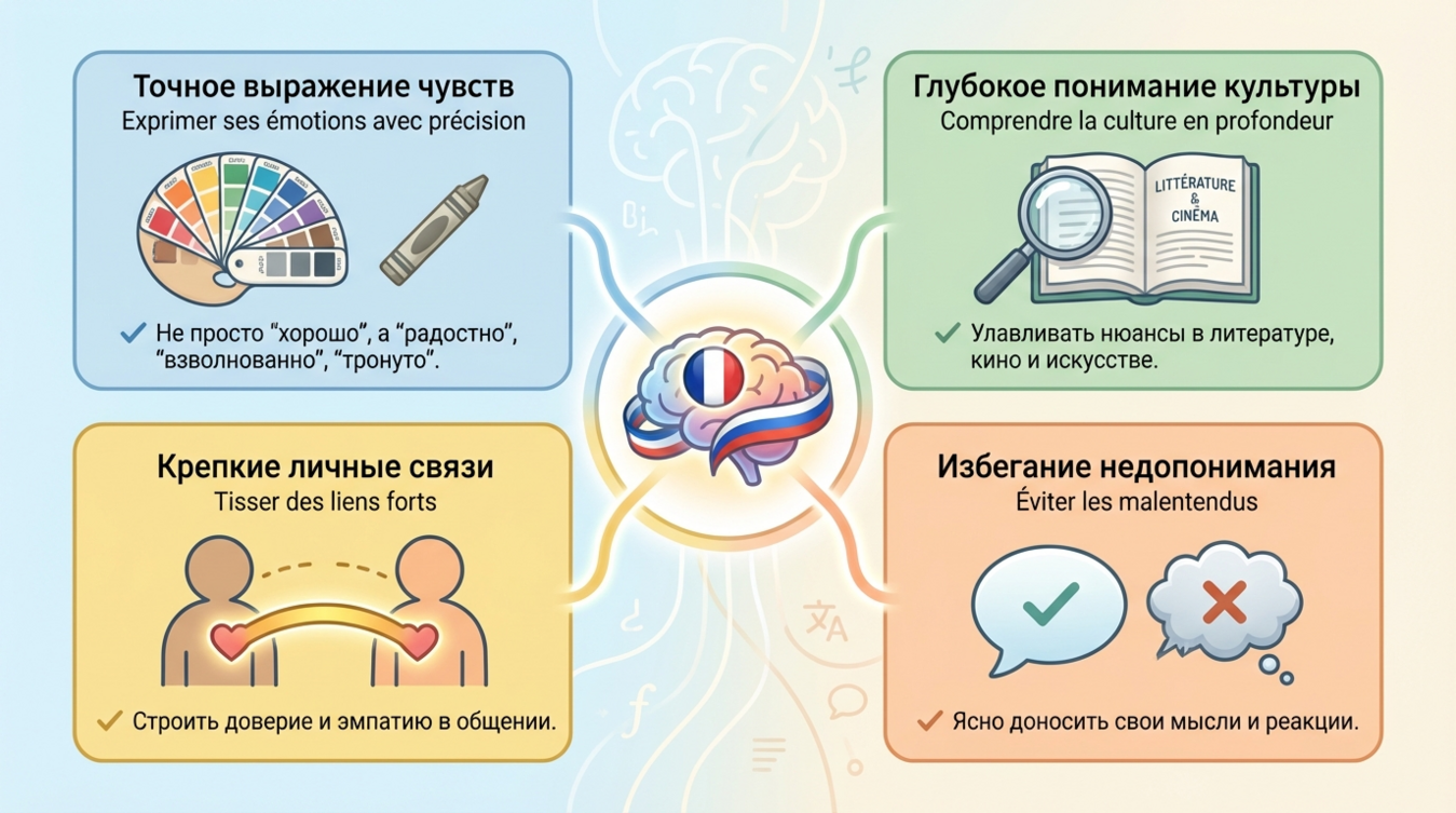 Пренебрежение эмоциональной лексикой оставляет вас в положении вечного наблюдателя, который понимает механику языка, но не чувствует его пульс. Французы — народ экспрессивный, и умение называть свои чувства воспринимается как базовая компетенция образованного человека.