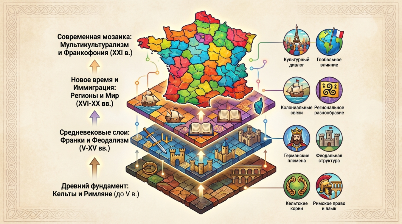 Французская нация — продукт целенаправленного конструирования, а не естественного этногенеза. Территория современной Франции изначально представляла собой конгломерат кельтских племён, романизированных после завоевания Цезарем в I веке до н.э. Галло-римская культура заложила основу, но последующие волны миграций германских племён (франков, бургундов, вестготов) добавили новые слои культурной идентичности.