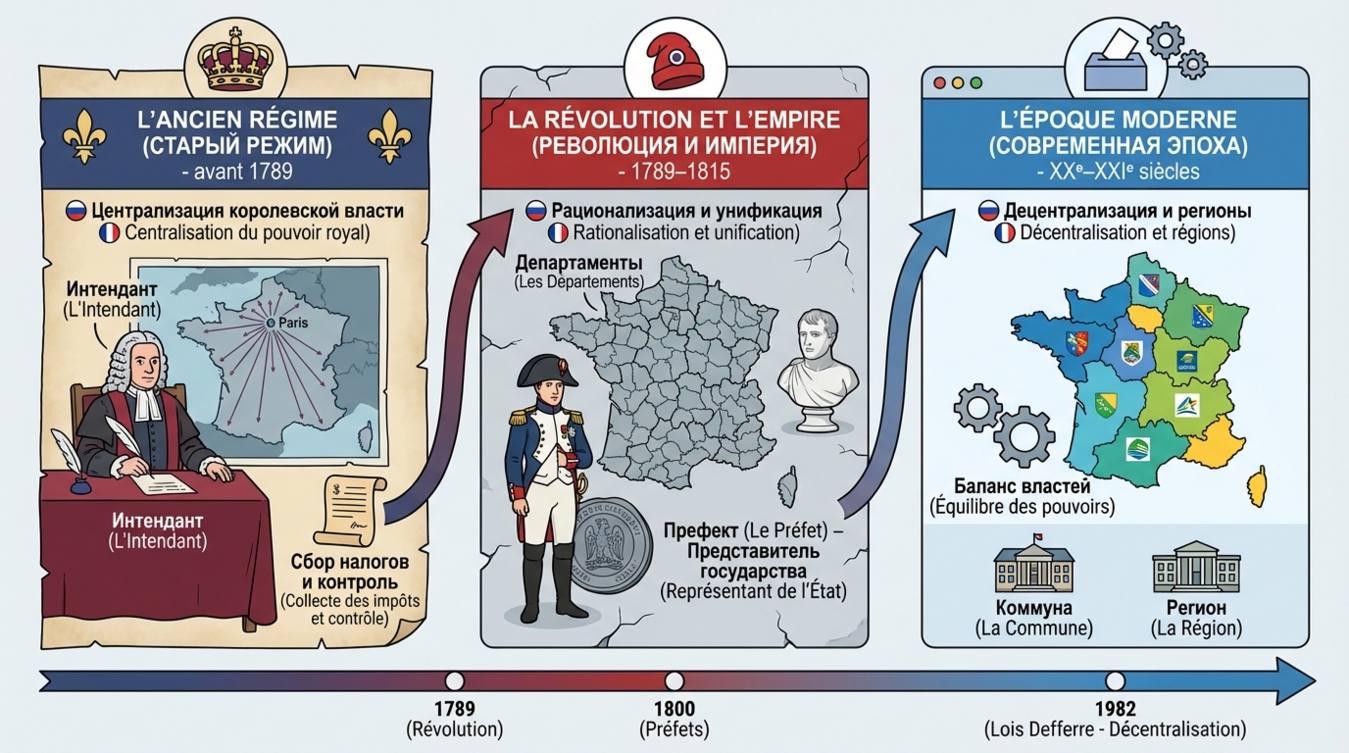| Абсолютизм (XVII век) | Система интендантов, централизация власти, тотальный контроль | Префектуры, вертикаль власти, отчётность |