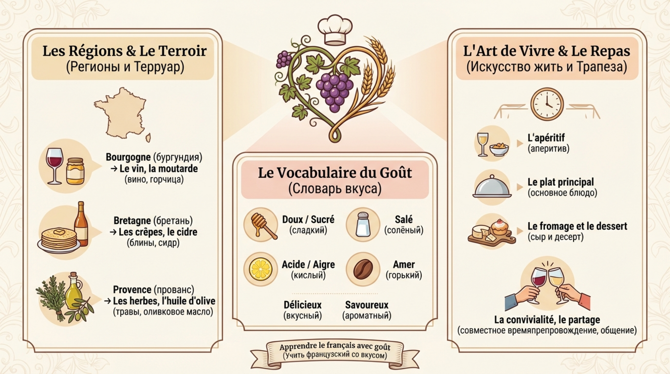 Французская кухня остаётся не музейным экспонатом, а живым организмом, эволюционирующим при сохранении фундаментальных принципов. Терруар, сезонность, уважение к продукту, застольный этикет — эти понятия формируют культурный каркас нации. Изучая французский язык без погружения в гастрономический контекст, вы теряете половину смыслов, скрытых в идиомах, пословицах, повседневных разговорах. «Raconter des salades» (рассказывать салаты) означает врать, «mettre du beurre dans les épinards» (добавить масло в шпинат) — улучшить финансовое положение, «avoir la moutarde qui monte au nez» (горчица поднимается к носу) — начать злиться. Кухня проникла в язык так глубоко, что невозможно провести границу между ними. Если вы хотите понять Францию — садитесь за стол, осваивайте словарь продуктов, учитесь держать вилку правильно, различайте терруары. Гастрономия здесь не дополнение к культуре — она и есть культура в её наиболее чистом и доступном выражении 🥂