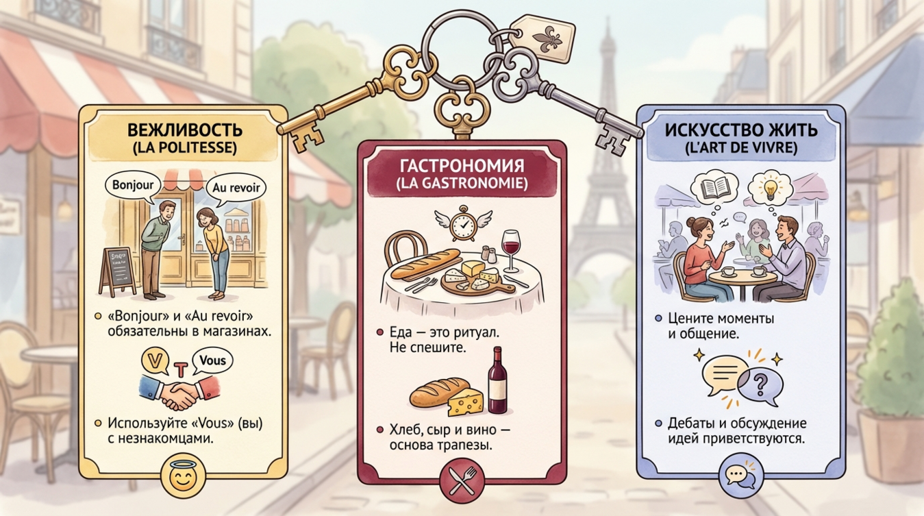 Понимание этих принципов даёт вам преимущество: вы перестанете воспринимать французское поведение как странное или высокомерное. Вместо этого вы увидите логику, стоящую за каждым жестом и словом. Именно это понимание отличает поверхностного туриста от человека, способного выстроить настоящий контакт с французской культурой.