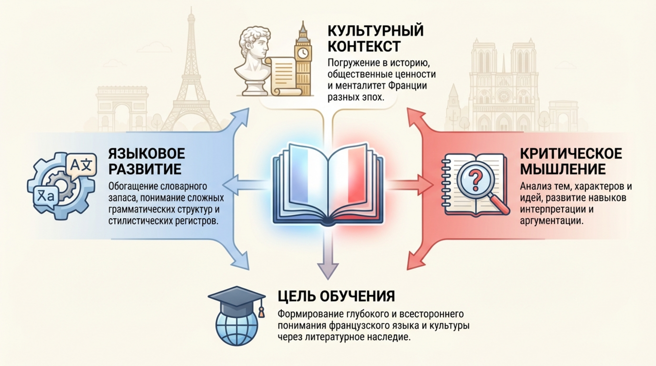 Классическая французская литература выполняет три ключевые функции в образовательном процессе. Первая — лингвистическая: произведения великих авторов демонстрируют эталонный французский язык, его синтаксические конструкции, богатство лексики и стилистические возможности. Учащиеся видят не искусственные учебные диалоги, а живую речь в её высшем проявлении.