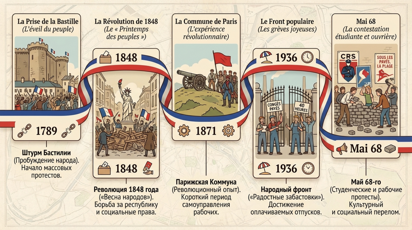 Французская протестная культура уходит корнями в эпоху Великой французской революции 1789 года, когда штурм Бастилии продемонстрировал: народ способен физически изменить политический строй через коллективное действие. Это событие закрепило в национальном сознании идею, что улица — легитимное пространство для выражения гражданской воли, а не просто транспортная артерия.