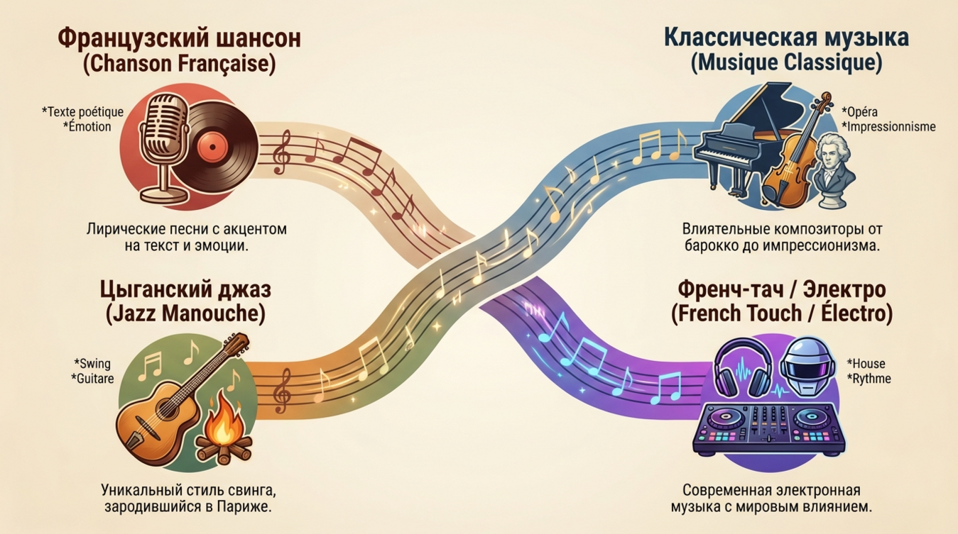 Музыкальные жанры Франции развивались параллельно социальным изменениям. Шансон отражает послевоенную романтизацию городской жизни, рэп вырос из иммигрантских кварталов как голос забытого поколения, а классическая традиция продолжает держать планку академического совершенства. Каждый жанр — это отдельная вселенная со своим словарём, своими героями и своей правдой.