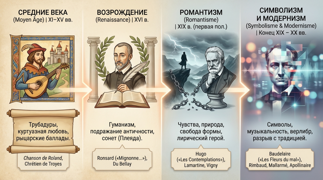 | 1870–1900 | Символизм | Музыкальность, намёк, синестезия, свободный стих | Верлен, Рембо, Малларме |