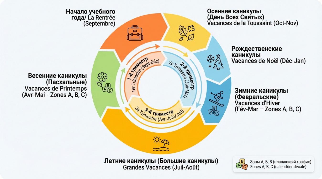 Учебный календарь охватывает следующие периоды каникул (по официальным данным Министерства образования Франции на 2024-2025 учебный год):