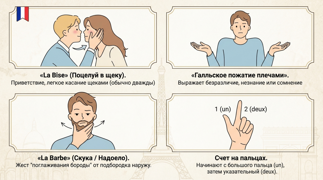 Ежедневная коммуникация французов насыщена специфическими жестами, неправильная интерпретация которых ведёт к недопониманию. Вот основные из них: