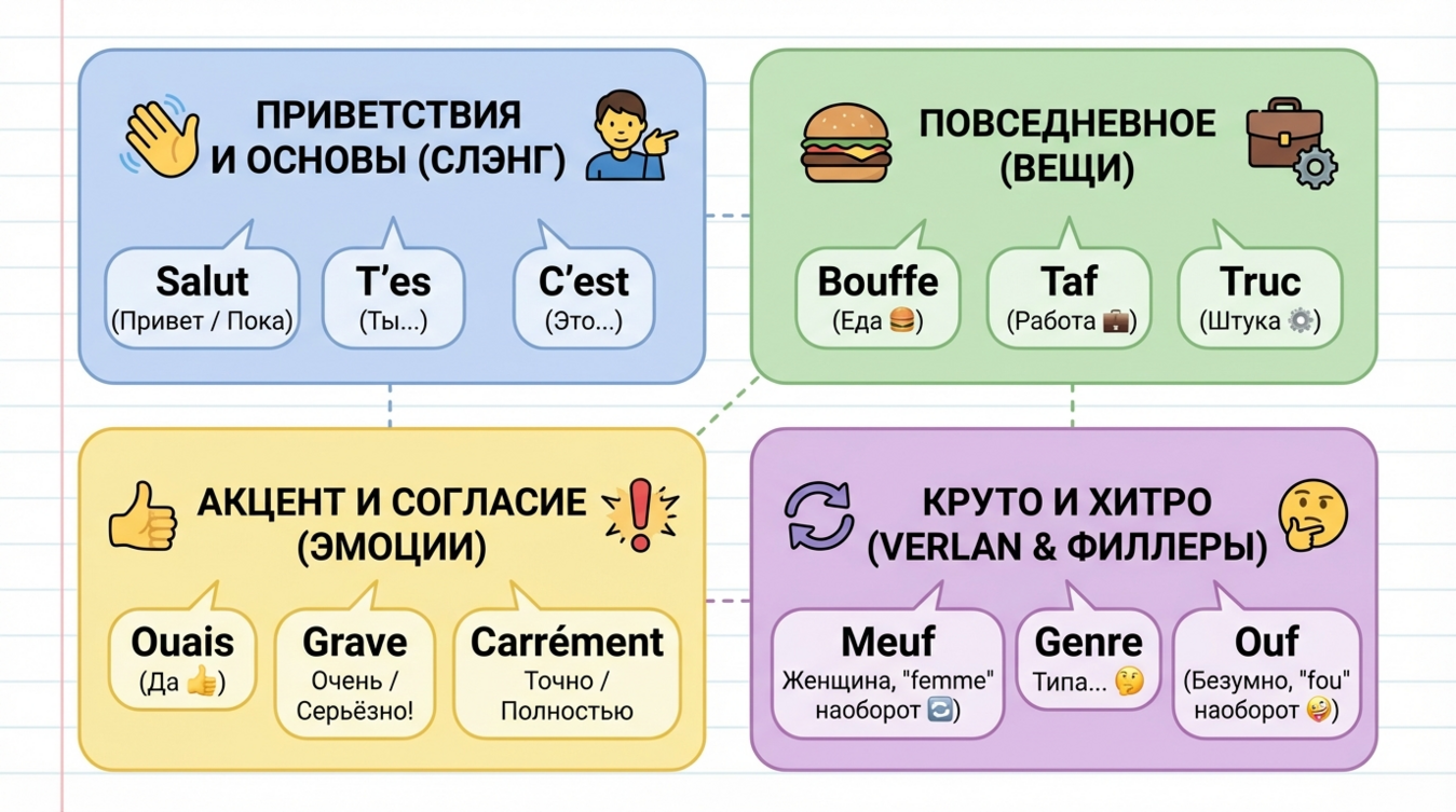 Основа французского сленга формировалась веками из нескольких источников. Верлан (verlan) — особая форма игры со словами, когда слоги переставляются в обратном порядке: "femme" становится "meuf", "louche" превращается в "chelou", "bizarre" — в "zarbi". Арго (argot) — исторический воровской жаргон, многие слова из которого прочно вошли в повседневную речь. Заимствования из арабского, африканских языков и английского обогатили французский жаргон новыми красками, особенно в крупных городах.