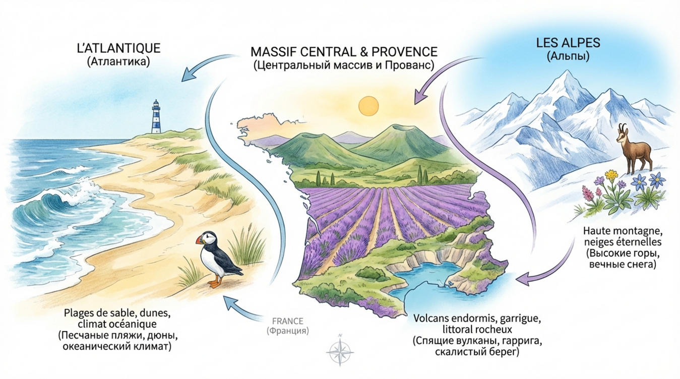 География не просто формирует экономику и климат — она проникает в язык, кухню, менталитет. Франция — унитарное государство, но региональные различия столь значительны, что иногда кажется, будто это разные страны.