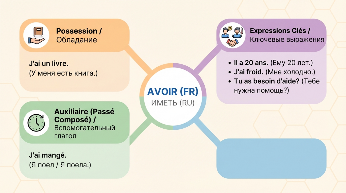 Использование avoir во французском языке далеко выходит за рамки обозначения владения. Множество конструкций, описывающих физические и эмоциональные состояния, возраст, потребности, строятся именно с этим глаголом там, где русский язык использует совершенно другие грамматические средства.