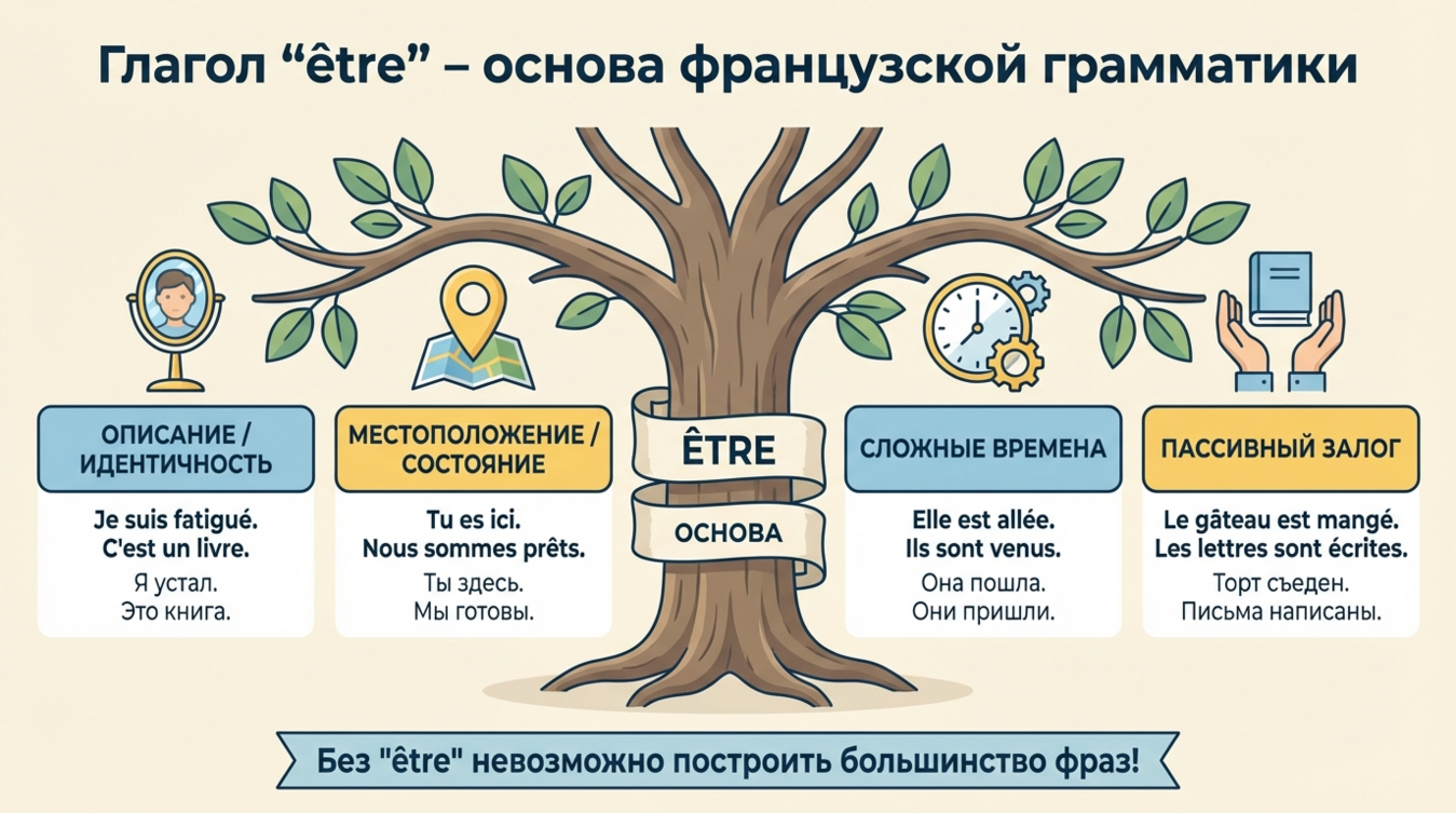 🎯 Практический совет: начинайте изучение французского именно с être. Не пытайтесь сразу браться за правильные глаголы первой группы — это ловушка для новичков. Овладев être и avoir, вы получите доступ к 80% базовых коммуникативных ситуаций.