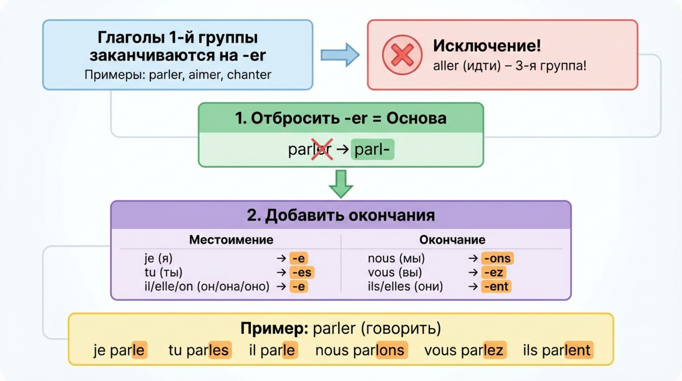 Глаголы первой группы во французском языке — это все глаголы, инфинитив которых заканчивается на -er, за исключением глагола aller (идти). Это самая многочисленная и регулярная группа глаголов, которая включает как старые французские слова, так и все новые заимствования. 📚