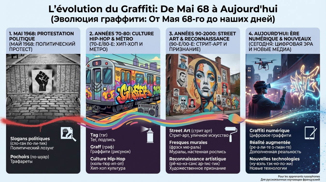 Французское граффити говорит на собственном языке — гибриде арго, англицизмов и неологизмов. Понимание этой лексики критично для тех, кто хочет не просто смотреть на уличное искусство, но и читать его культурный код 📝
