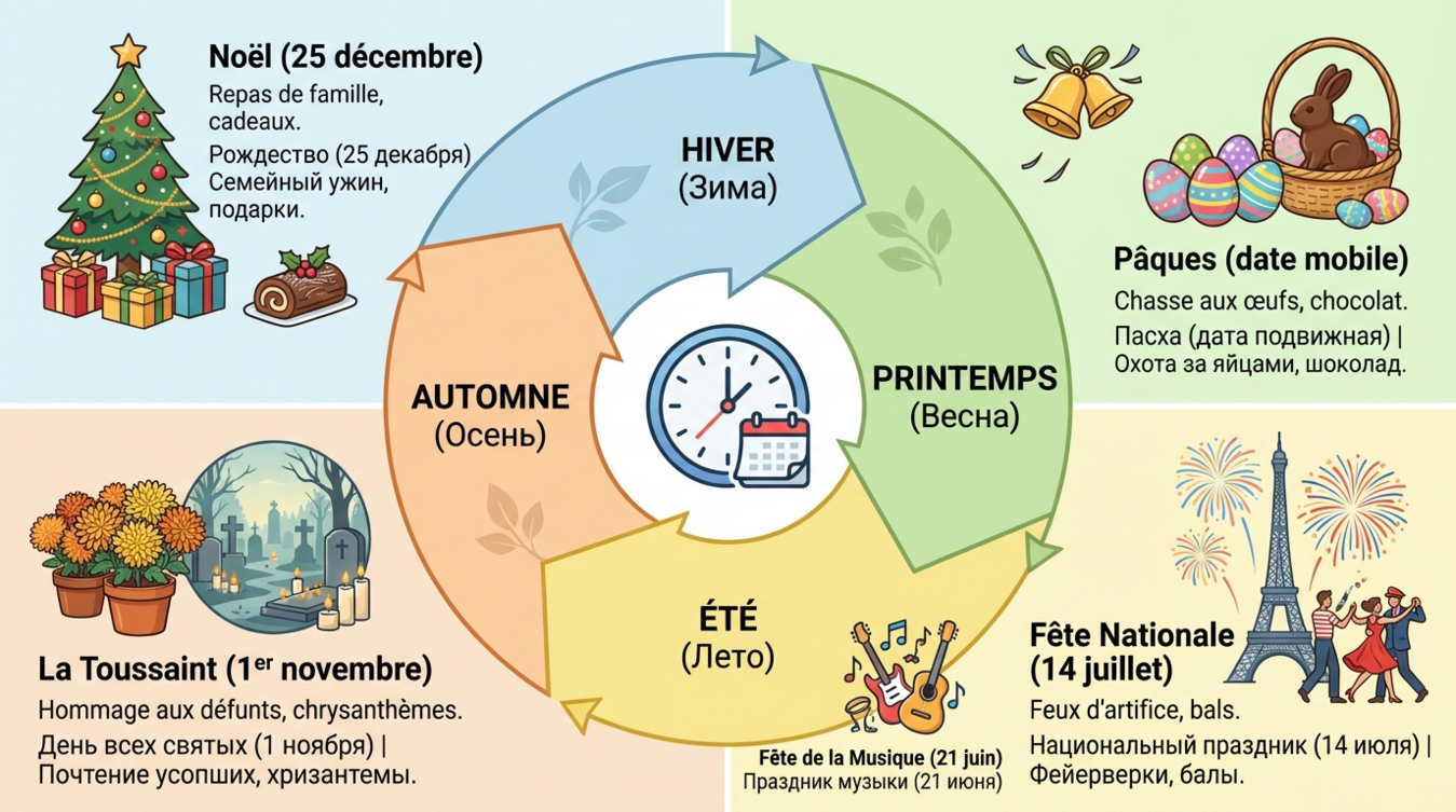 Календарные праздники во Франции функционируют как маркеры социального времени. La rentrée (возвращение после летних каникул) в сентябре психологически важнее официального Нового года. Beaujolais Nouveau в третий четверг ноября становится неформальным рубежом между осенью и предзимьем. А Fête de la Musique 21 июня официально открывает летний сезон, несмотря на астрономическую дату солнцестояния.