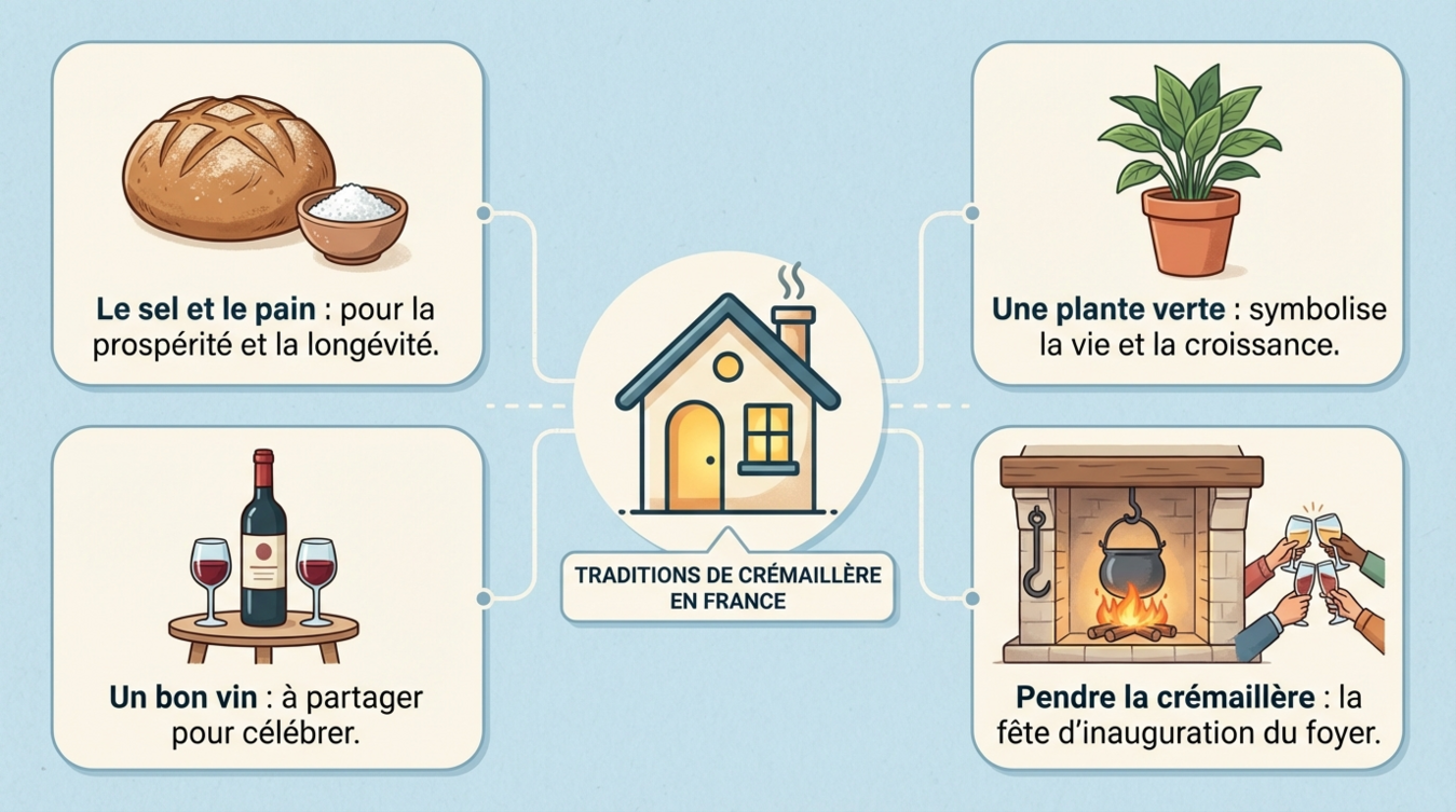 Французы относятся к новоселью как к важному жизненному этапу, требующему публичного признания. Переезд не считается завершённым, пока друзья и близкие не побывают в новом жилище. Эта традиция называется la pendaison de crémaillère — буквально "подвешивание крюка для котла". В прошлом этот железный крюк символизировал обустройство очага, а значит, готовность семьи принимать гостей.