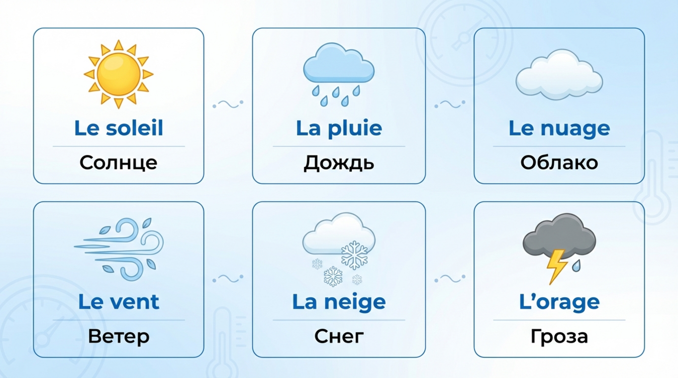 Основные существительные требуют точного запоминания артиклей. Le soleil (солнце), la pluie (дождь), le vent (ветер), la neige (снег), le nuage (облако), le brouillard (туман), l'orage (гроза) — эти семь слов покрывают 80% повседневных погодных ситуаций. Обратите внимание: французы различают la bruine (морось) и la pluie (обычный дождь), тогда как в русском мы часто обобщаем.