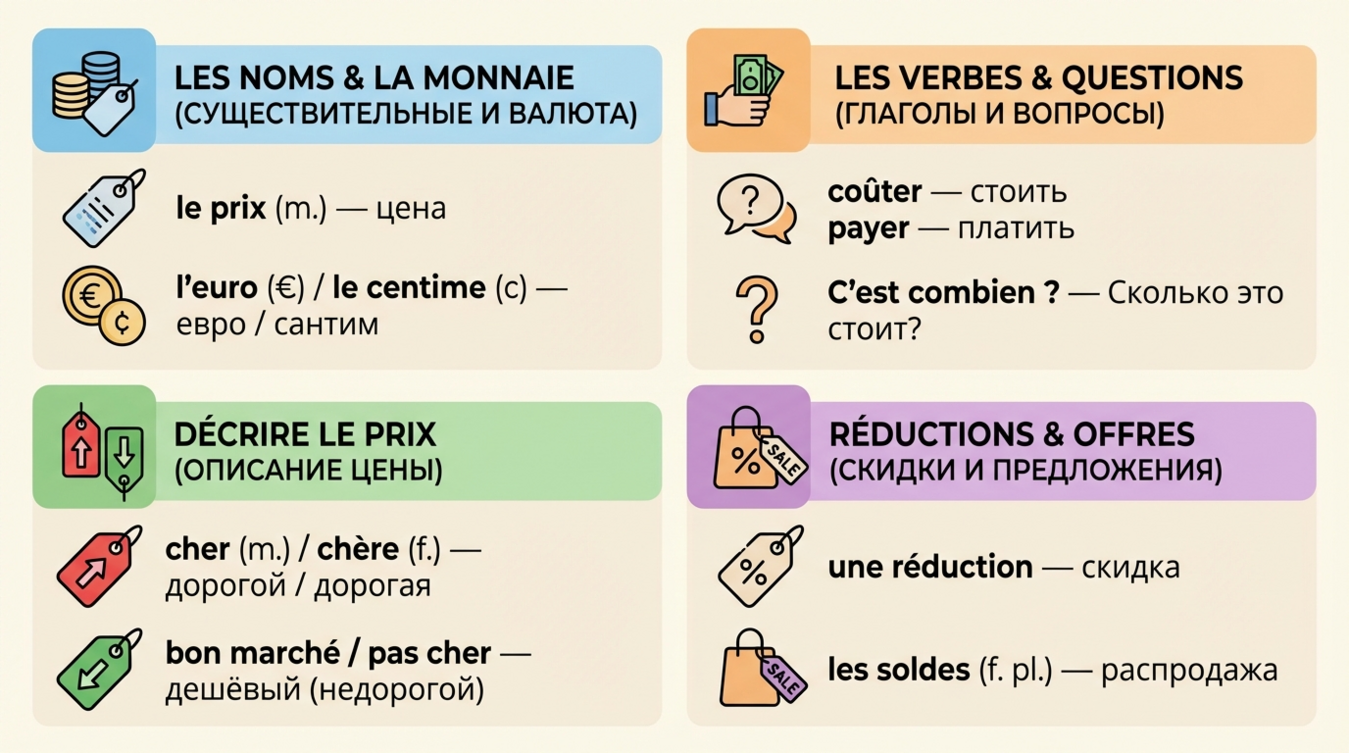 Овладение базовым словарным запасом для разговора о ценах — это фундамент успешного шоппинга. Французы ценят точность и конкретику в коммерческих вопросах, поэтому знание нужных слов сразу создаёт впечатление компетентного покупателя.