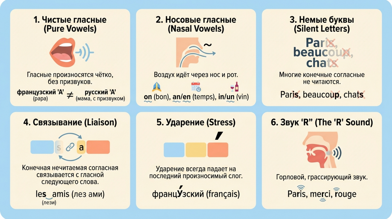 Второй принцип — назальность. Четыре носовых гласных [ɑ̃], [ɛ̃], [ɔ̃], [œ̃] не имеют аналогов в русском языке и формируются путём опускания нёбной занавески, что позволяет воздуху проходить одновременно через рот и нос. Это не «произнесение в нос», как ошибочно считают новички, а специфическая артикуляция, требующая физической перестройки речевого аппарата.