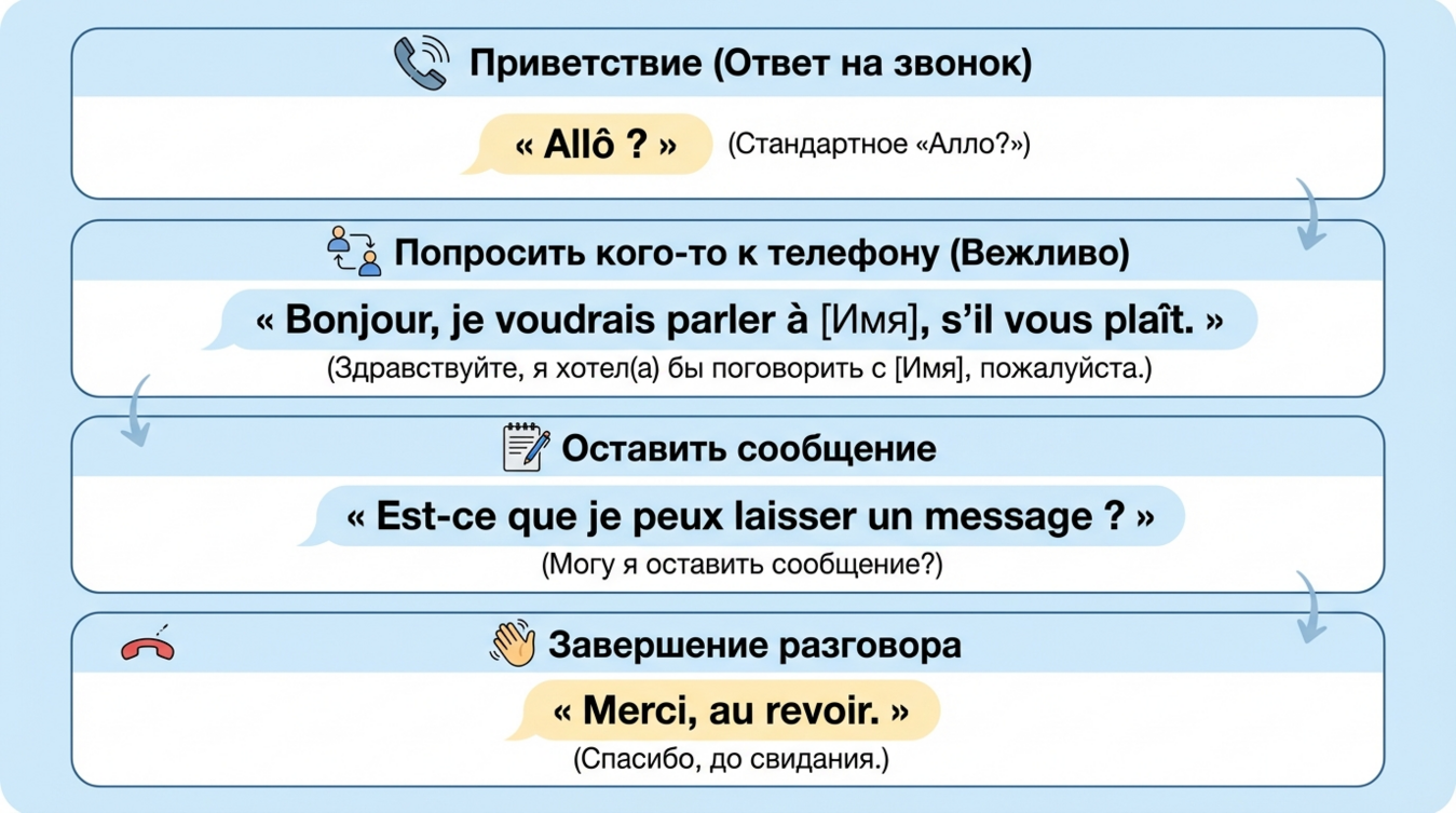 | Полуформальный | Allô, c'est [имя] | Merci et bonne journée! |