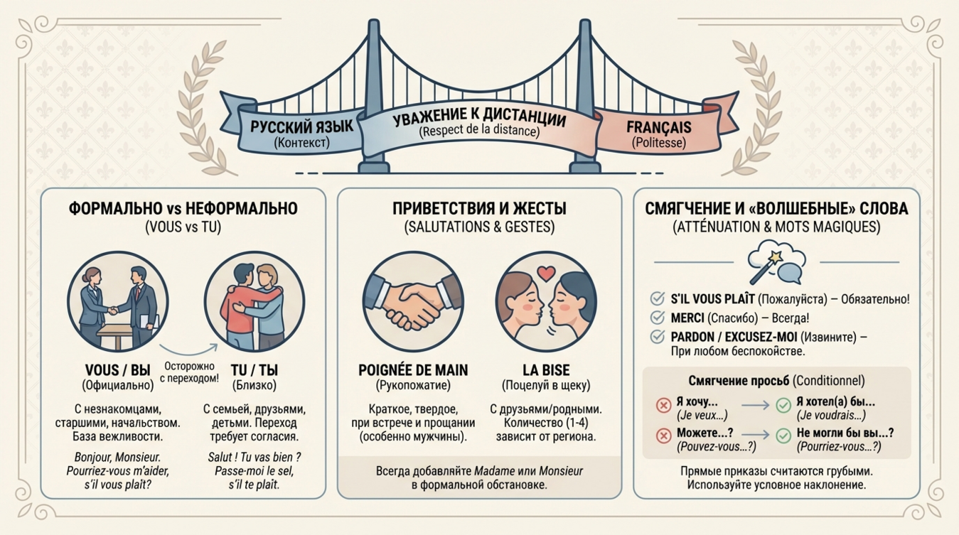 Вежливая речь по-французски строится на трёх китах: правильное использование местоимений, условное наклонение и устоявшиеся речевые обороты. Пренебрежение хотя бы одним из этих элементов создаёт впечатление невоспитанности или незнания базовых норм. Согласно исследованию Французского института общественного мнения (IFOP), 78% французов считают использование «vous» вместо «tu» при первом знакомстве обязательным признаком уважения.