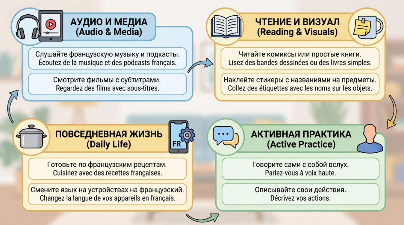 Использование французского языка дома каждый день — это не вопрос мотивации или свободного времени. Это вопрос системы. Вы не добавляете новые задачи в расписание. Вы заменяете русский язык на французский в тех действиях, которые уже совершаете ежедневно: готовите, смотрите фильмы, слушаете музыку, читаете перед сном. Погружение в языковую среду не требует переезда за границу — оно требует осознанного выбора использовать французский там, где вы привыкли использовать родной язык. Начните с одного ритуала. Добавьте второй через неделю. Через месяц французский станет частью вашего дома. Через три — частью вашей жизни. Это не быстро, но это работает надежнее любого интенсива.