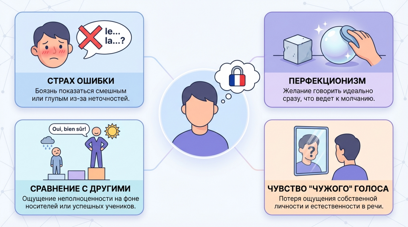 Языковой барьер — это не недостаток знаний, а психологическая защита, которую мозг выстраивает против возможного стыда или неудачи. Когда вы начинаете говорить на французском, активируются сразу несколько тревожных механизмов: страх ошибиться, боязнь осуждения, перфекционизм и социальное давление. Исследование Университета Париж-Сорбонна показало, что 68% изучающих французский язык испытывают повышенную тревожность именно при устном общении, в то время как при чтении или письме этот показатель не превышает 23%.