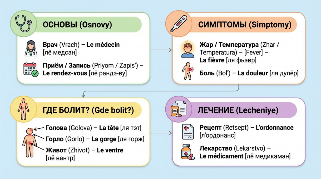 Представьте: вы в Париже, наслаждаетесь круассанами и прогулками вдоль Сены, и внезапно чувствуете острую боль в животе. Или просыпаетесь с высокой температурой в отеле Ниццы. Паника? Беспомощность? Страх, что не сможете объяснить врачу, что именно болит? Эта ситуация знакома многим русскоязычным путешественникам. Умение точно описать свои симптомы на французском языке — не просто полезный навык, это вопрос получения качественной медицинской помощи и вашей безопасности за границей. Французские врачи не обязаны говорить по-английски, а тем более по-русски, и промедление с правильной диагностикой из-за языкового барьера может стоить дорого — в прямом и переносном смысле 💊