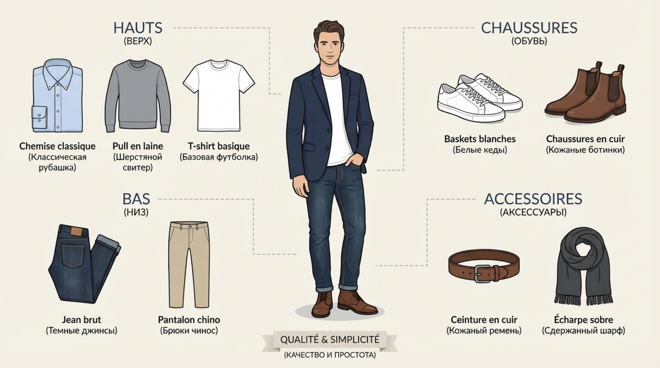 - Кожаные туфли или минималистичные кроссовки (les chaussures en cuir, les baskets) — ухоженные и без кричащих логотипов