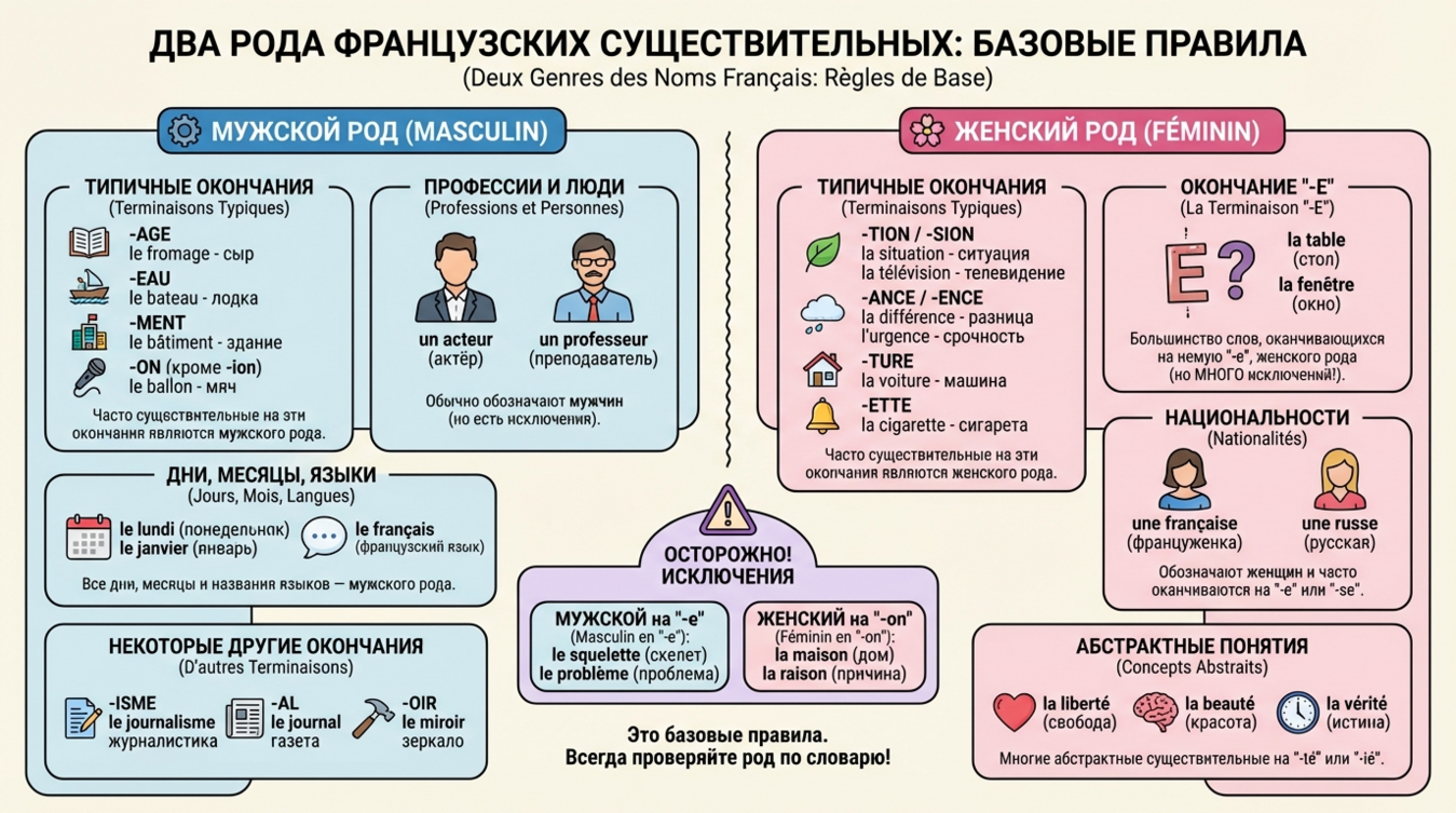 Во французском языке существует ровно два рода: мужской (masculin) и женский (féminin). Средний род, к которому привыкли носители русского или немецкого, здесь отсутствует. Каждое существительное безоговорочно принадлежит либо к одному, либо к другому роду, и эта принадлежность влияет на согласование артиклей, прилагательных и местоимений.