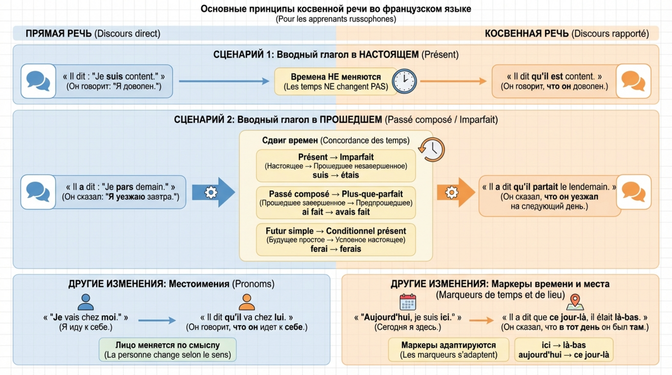 Французский синтаксис строится на чёткой логике временных соотношений. Когда вы переводите прямую речь в косвенную, главное правило — согласование времён (concordance des temps). Если глагол-вводитель (dire, affirmer, répondre) стоит в прошедшем времени, все времена в придаточном предложении сдвигаются назад. Это называется "attraction modale" — притяжение времён.