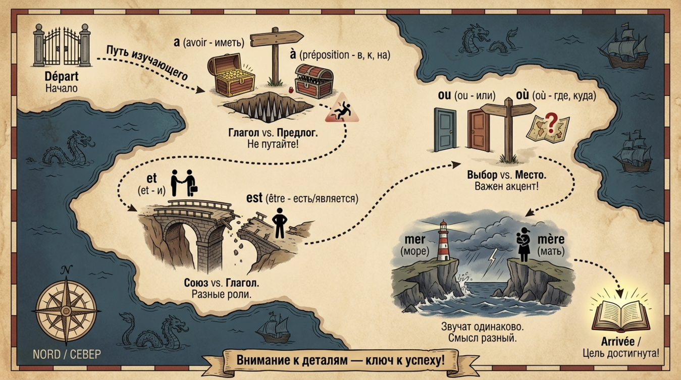 Французская орфография — минное поле для изучающих язык. Слова, отличающиеся одной буквой, могут переворачивать смысл фразы с ног на голову. Написали "poison" вместо "poisson"? Поздравляю, вы предложили гостю яд вместо рыбы. Перепутали "désert" и "dessert"? Официант принесёт пустыню на тарелке вместо десерта. Такие лексические ловушки не просто создают забавные недоразумения — они подрывают доверие к вашей языковой компетенции и могут стоить профессиональной репутации. Французский язык полон паронимов и омонимов, различение которых требует системного подхода, а не случайного везения. В этой статье я покажу конкретные методики, которые помогут навсегда запомнить разницу между коварными парами слов и перестать полагаться на автокорректор.