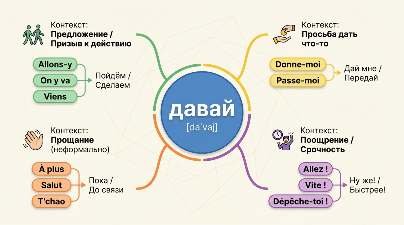 Слово «давай» в русском языке выполняет десятки функций: от предложения совместного действия («давай пойдём») до выражения согласия («давай, договорились») и призыва к немедленному действию («давай быстрее!»). Expression française не терпит такой универсальности — французы предпочитают точность.