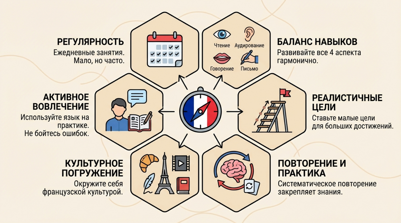 Первое, что нужно понять: универсальных методик не существует. То, что сработало для вашего знакомого, может оказаться бесполезным для вас. Структурированный подход к французскому строится на четырёх фундаментальных принципах, которые я проверял на практике с сотнями студентов.
