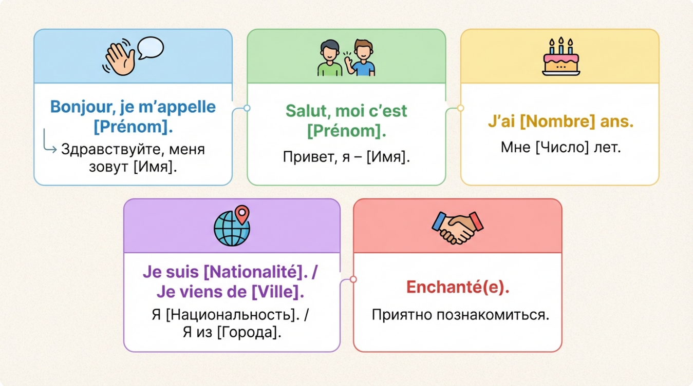 - Bonjour, je m'appelle [имя] — Здравствуйте, меня зовут [имя]