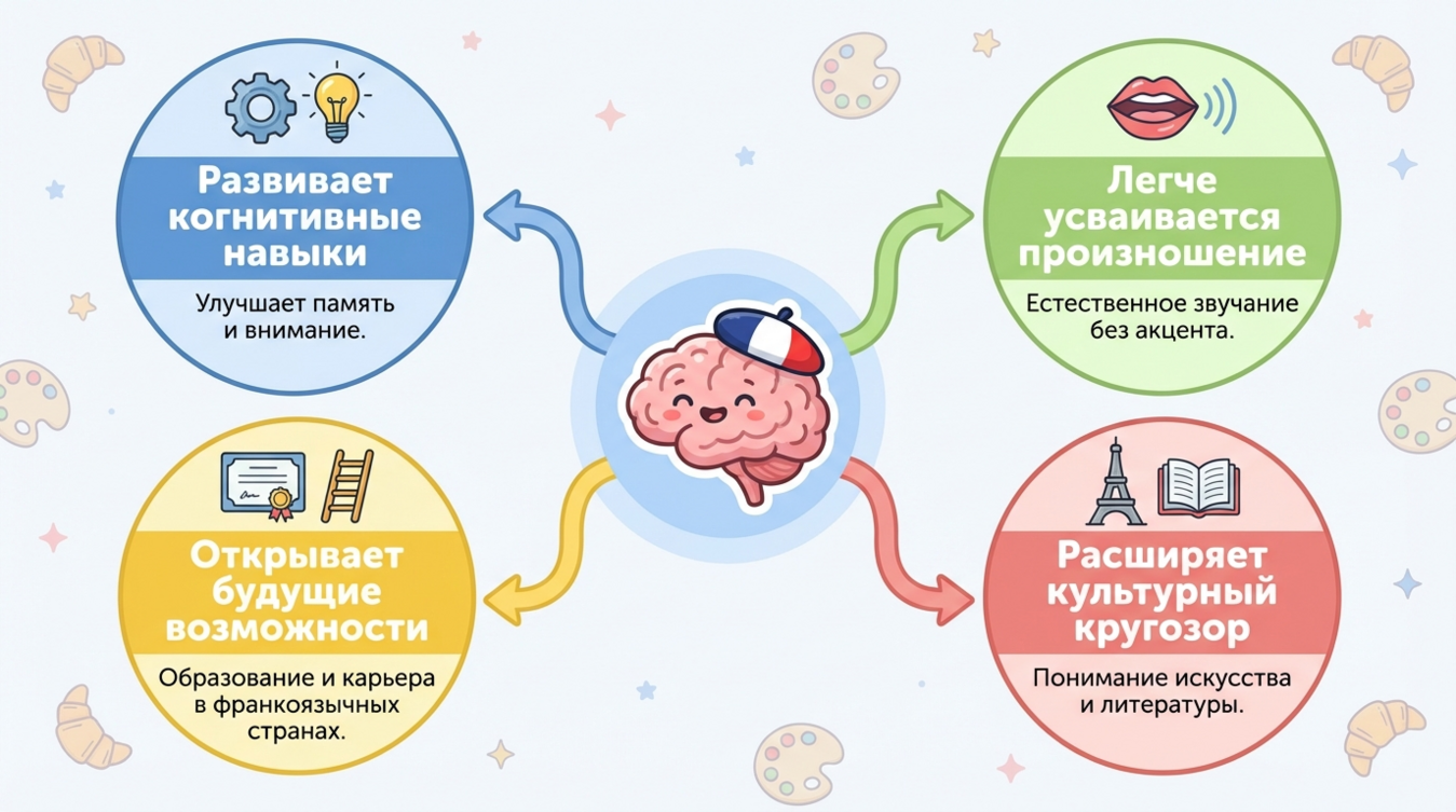 Французский язык — не просто предмет школьной программы, а билет в мир элегантной культуры, дипломатии и международных возможностей. Вы можете подарить своему ребёнку этот билет уже сейчас, не дожидаясь первого класса и не полагаясь исключительно на репетиторов. Раннее языковое развитие формирует не только навыки коммуникации, но и когнитивные способности, которые останутся с человеком на всю жизнь. Многие родители упускают золотое время — период до 7 лет, когда мозг ребёнка способен усваивать языки естественным образом, без мучительной зубрёжки грамматики. Эта статья даст вам конкретные инструменты для того, чтобы французский органично вошёл в жизнь вашей семьи.
