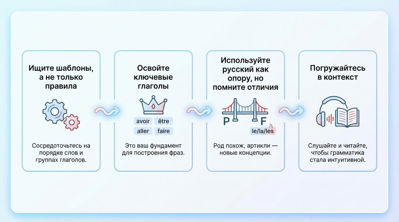 Быстрое освоение грамматики — это не про скорочтение учебников. Это про понимание логики языка. Французский развивался столетиями, и многие "странные" правила имеют историческое объяснение. Когда вы понимаете, почему артикль перед гласной сокращается (l'ami вместо le ami), запоминание происходит естественно.