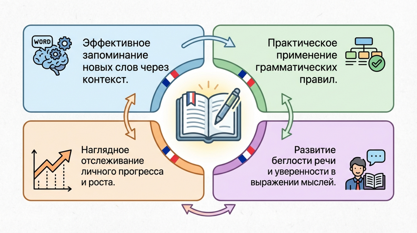 Ведение дневника на французском языке решает главную проблему изучающих — отсутствие регулярной письменной практики в естественном контексте. В отличие от учебных упражнений, где вы вставляете пропущенные слова или переводите готовые фразы, journal intime заставляет вас создавать оригинальные высказывания, опираясь на собственный опыт и эмоции.