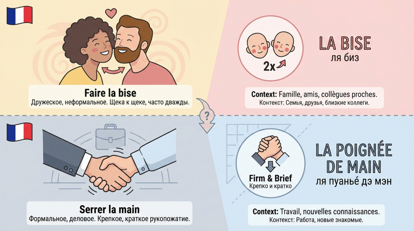 La bise (воздушные поцелуи в щёки) — классика французского приветствия, но новички часто совершают здесь ошибки. Количество поцелуев варьируется в зависимости от региона: в Париже — два, в Провансе — три, а в некоторых департаментах и четыре. Мужчины целуют женщин и детей, женщины целуют всех, но мужчины между собой ограничиваются рукопожатием, если только они не близкие друзья или родственники.