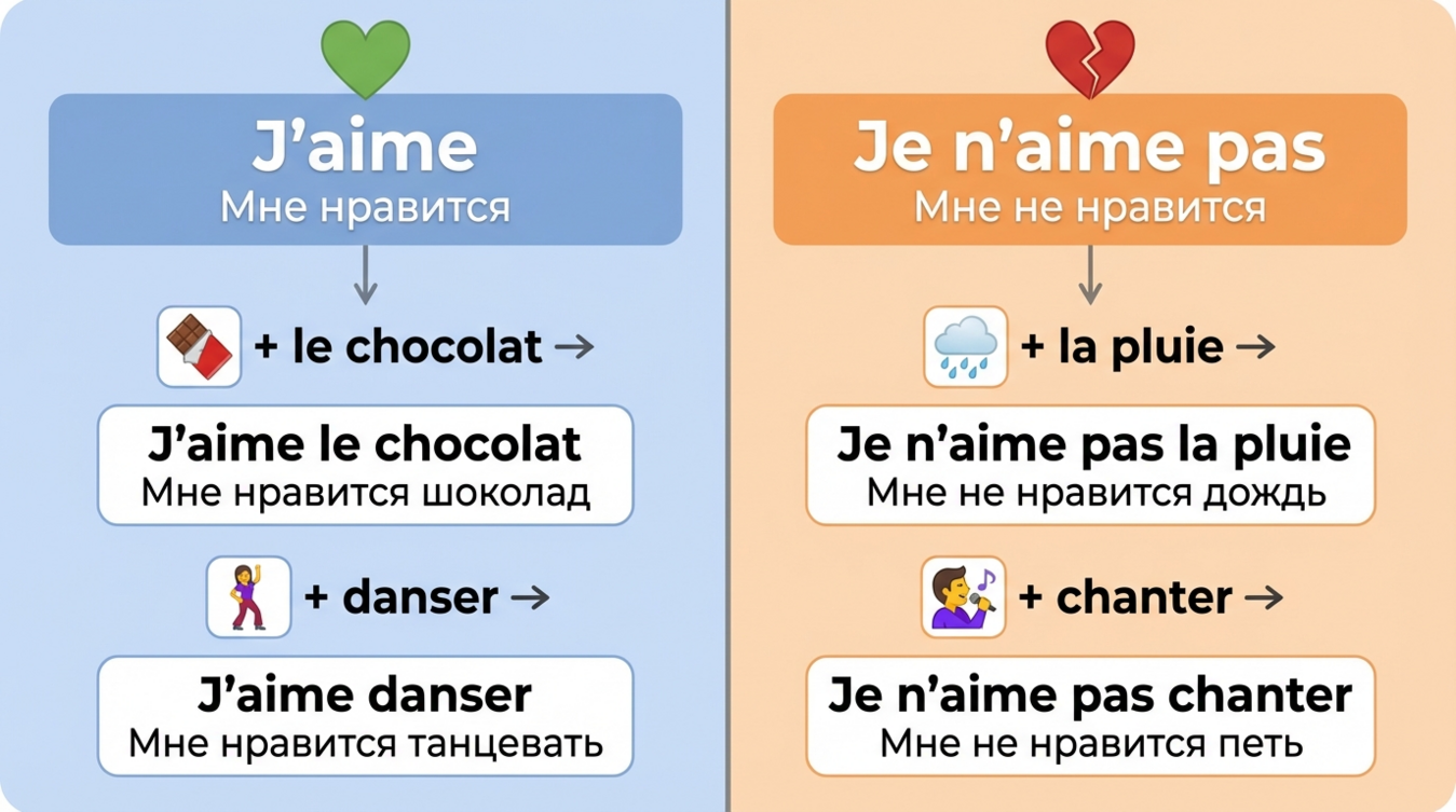 Ещё один важный момент: отрицательная форма. «Je n'aime pas» — это прямое и довольно резкое «мне не нравится». Если вы хотите смягчить отказ, используйте «Je n'aime pas trop» (мне не очень нравится) или «Ce n'est pas mon préféré» (это не моё любимое). Французская вежливость требует дипломатичности даже в выражении неприязни 😊.