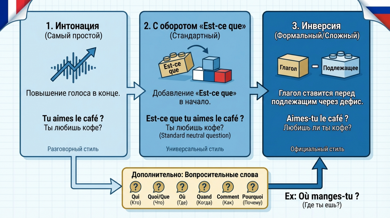 Французская грамматика предлагает три основных способа построения вопросов, каждый из которых имеет свою сферу применения и уровень формальности. Начнём с базовой схемы и постепенно перейдём к более сложным конструкциям.