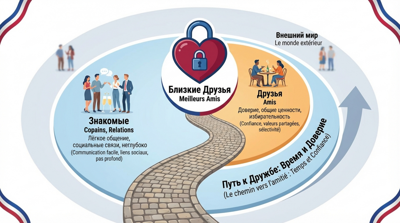 Переход между этими категориями медленный и требует демонстрации надёжности, интеллектуальной совместимости и культурного понимания. Французы не торопятся открываться, потому что дружба для них — серьёзное обязательство, а не лёгкая социальная связь.