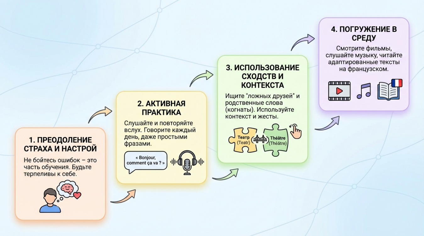 Произношение — это не просто красивость речи, это фундамент уверенности. Когда вы знаете, что звучите правильно, вы автоматически чувствуете себя увереннее. И наоборот: осознание, что акцент режет ухо, убивает желание говорить. Французская фонетика действительно сложна для русскоговорящих, но вполне поддаётся систематической тренировке.