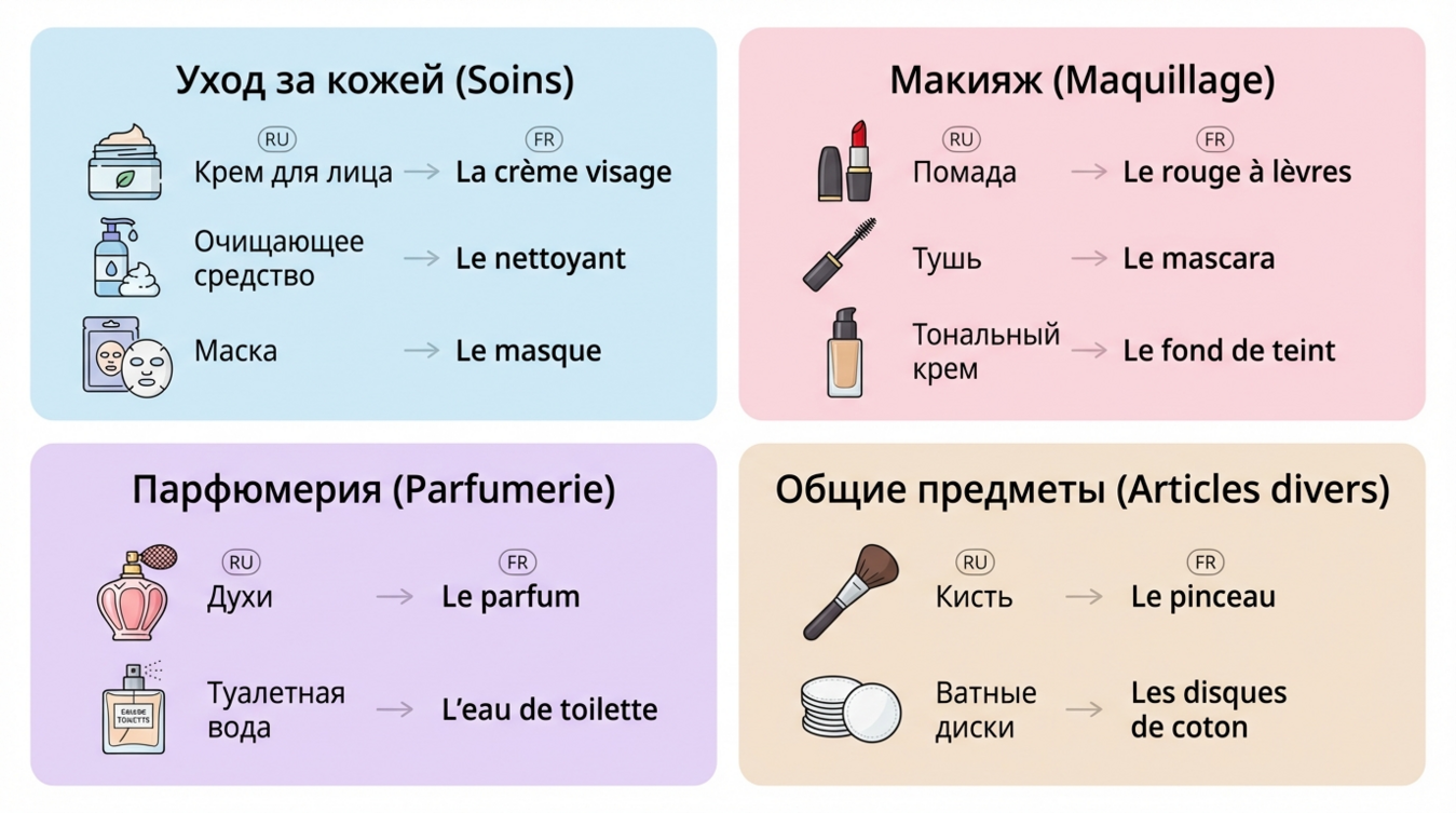 Согласно исследованию Французской ассоциации косметической промышленности (FEBEA), 87% французов ежедневно используют минимум три косметических средства, что делает эту лексику критически важной для повседневного общения в магазинах.